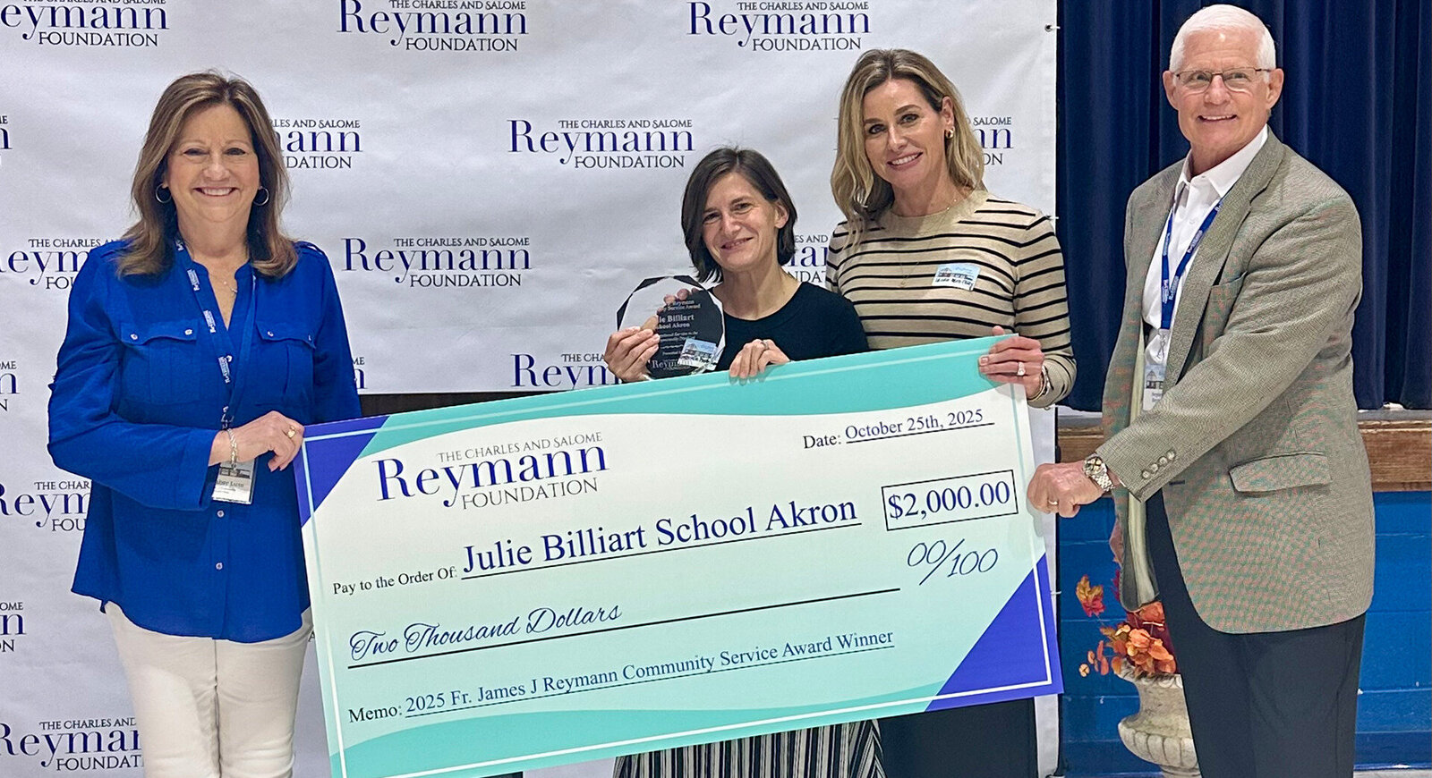 AKRON, Ohio – Julie Billiart Schools Akron was honored to receive the Fr. James J. Reymann Community Service Award from the Charles and Salome Reymann Foundation on Saturday, Oct. 25 at the Foundation’s new headquarters.